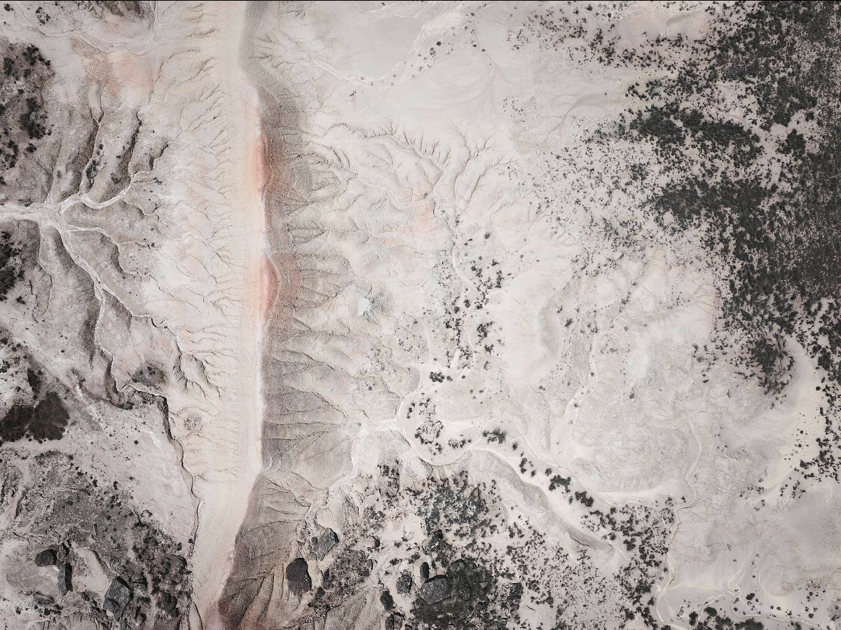 Het geërodeerde landschap loodrecht van boven gefotografeerd vanaf een hoogte van circa 100 meter.
