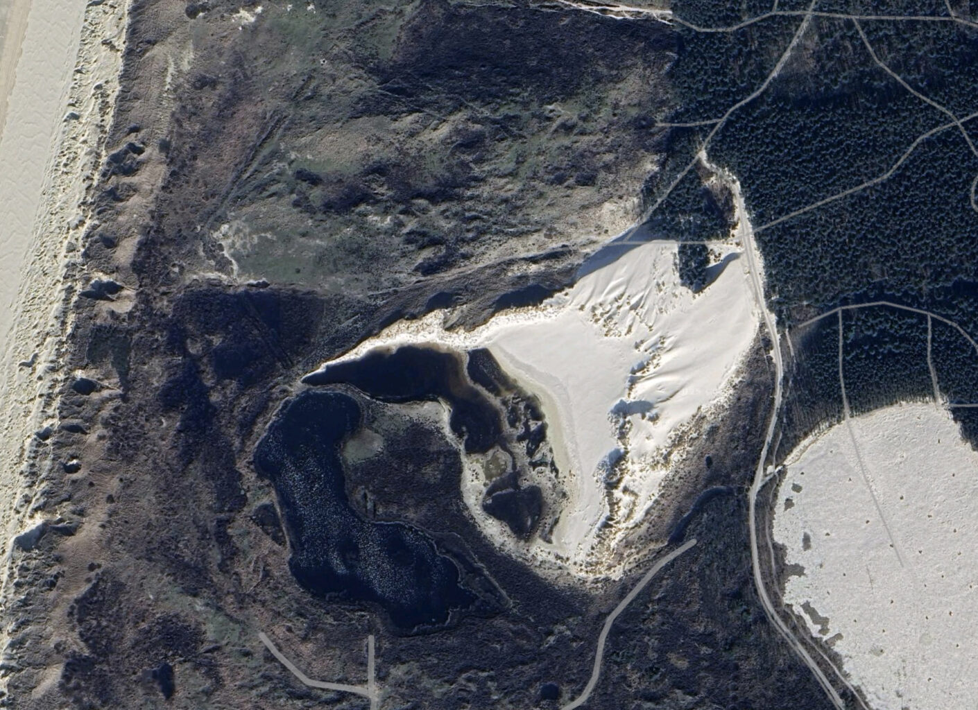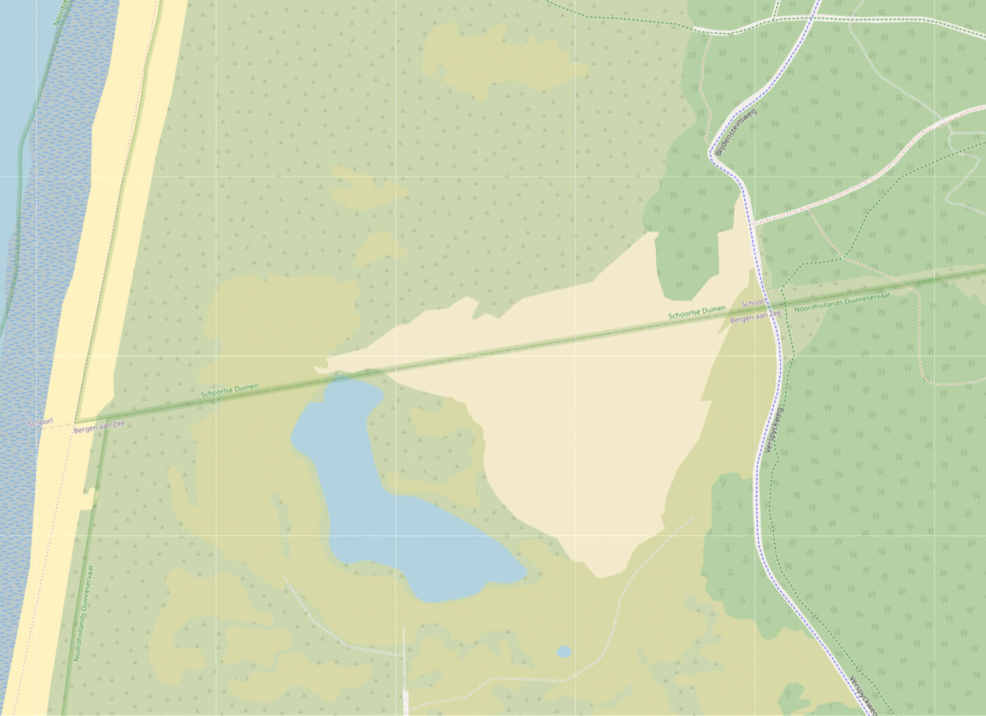 Het huidige landschap is de afgelopen jaren ontstaan door het kappen van naaldbomen, oorspronkelijk was er sprake van bos aangelegd om het stuiven van het zand tegen te gaan. Dit bos diende tevens als productiebos voor mijnhout (overigens was niet alleen de recente kap op grote schaal omstreden, ook de aanleg van deze bossen na de Tweede Wereldoorlog kon op de nodige weerstand rekenen). De recreatieve fietstocht wordt vervolgd in Noordelijk richting, ik passeer de grens tussen Bergen en Schoorl, de rechte lijn op de topografische kaart. Dit grensgebied wordt gekenmerkt door wandelende duinen en zoals de sateliet-foto en de kaart laten laten zien, wordt het fietspad ondergestoven. Dat wandelende duin is een intrigerend gegeven, ik ga de volgende dag teug om hier te fotograferen (terzijde: je kunt op zowel de Topografische kaart als de Google sateliet-foto klikken om het gebied in detail te zien).