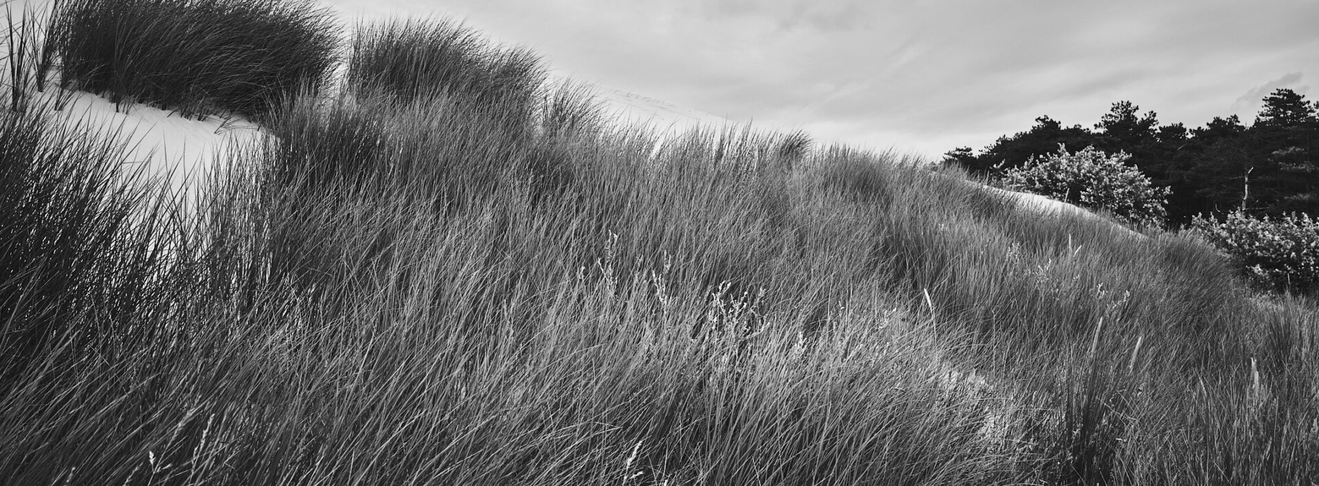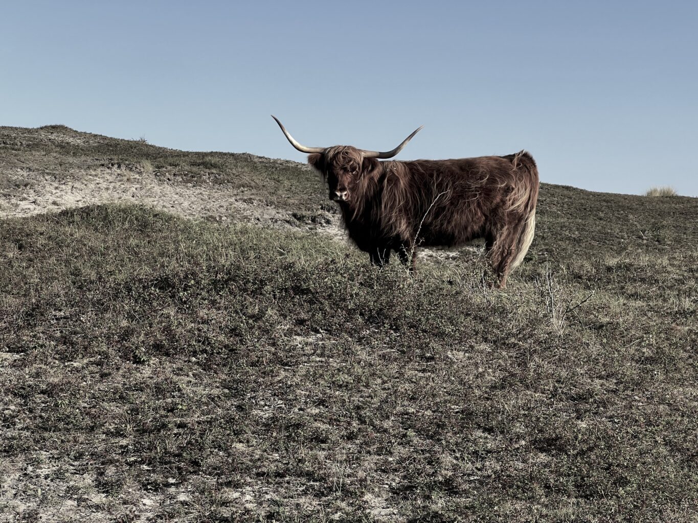 De volgende dag keer ik terug naar het Wandelende duin op de grens van de Staatsbossen (Schoorl) en die van de PWN (Bergen). Einde middag, licht bewolkt, mooi zacht licht, rustige omgeving en hoewel het zondag is weinig passanten. Dat laatste komt goed uit, om aan de voet van het duin te komen, daar waar vegetatie en zand visueel in wisselwerking zijn, klim ik over het hek, in de verte gade geslagen door een groepje Schotse Hooglanders.