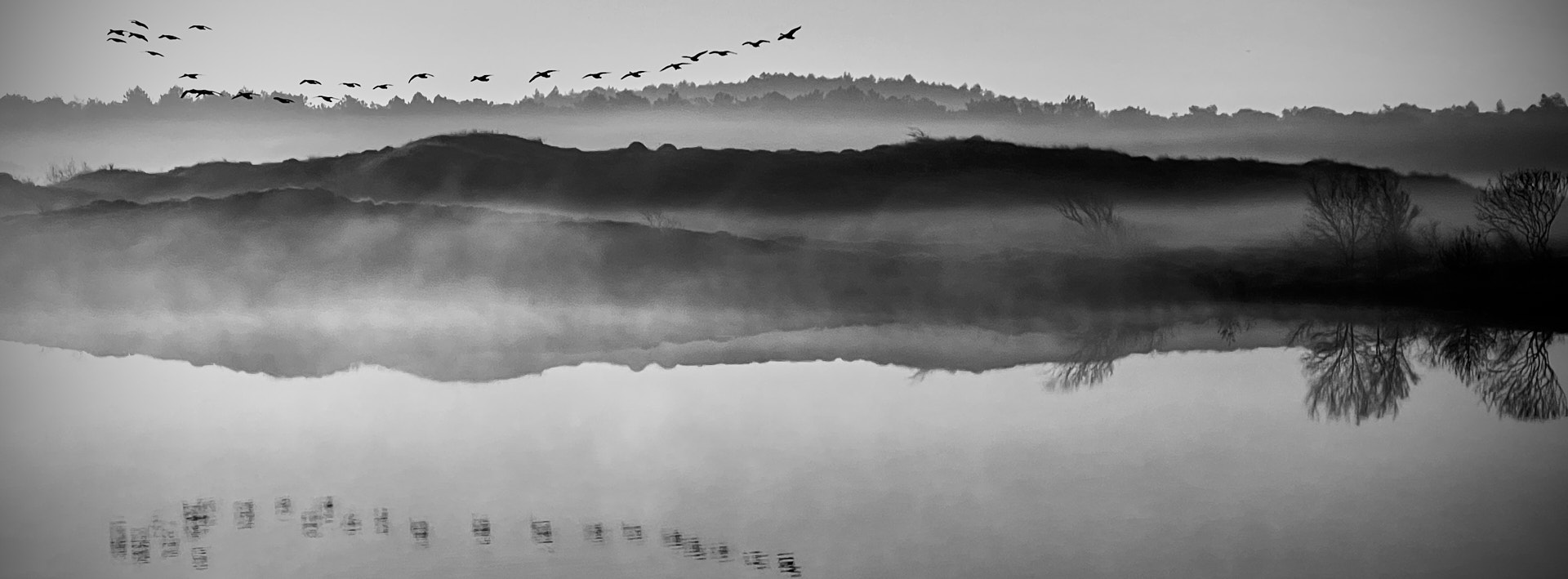 Op deze winterse herfstochtend profiteer ik van de vochtigheid, boven het Vogelmeer en in de directe (vochtige) omgeving er van een dunne laag mist, een fotogeniek gegeven zeker als ik van het tegenlicht van de opkomende zon gebruik maak. Ik loop dicht langs de oever van het meer, de ondergrond is bevroren en een dun laagje ijs rond de boompjes in het water.