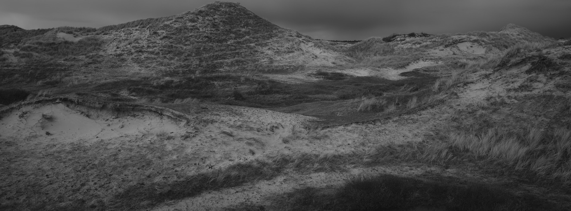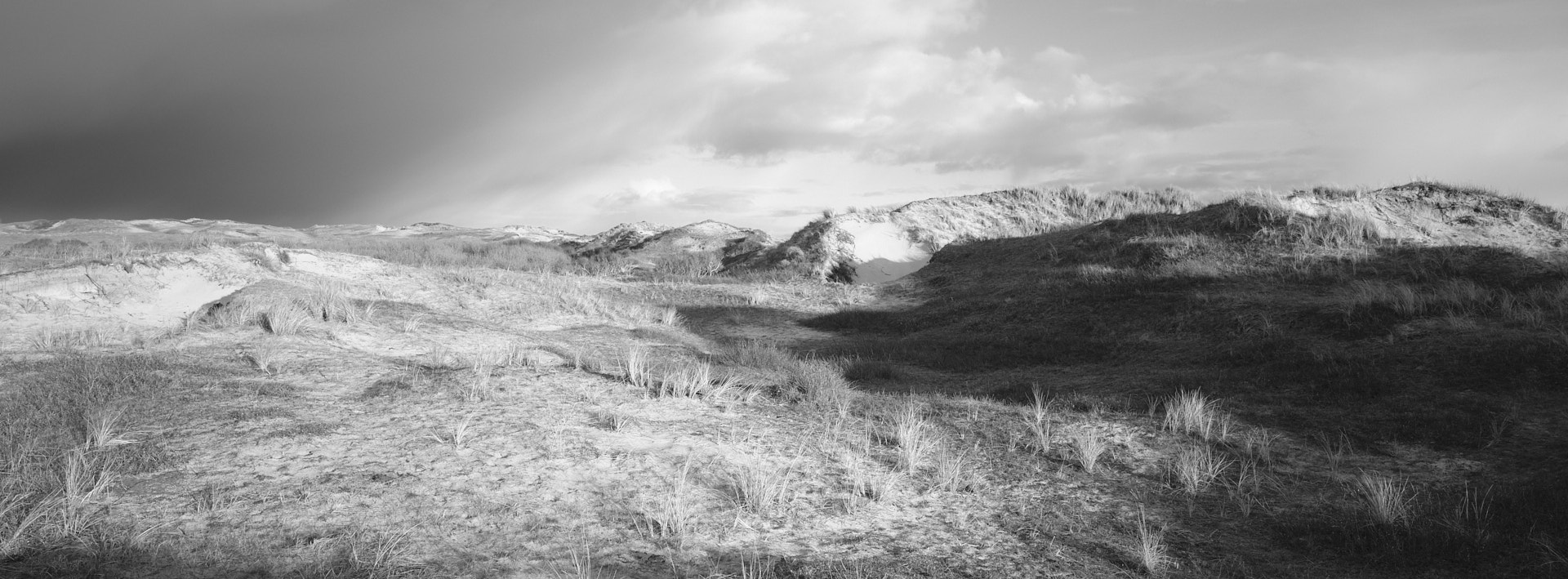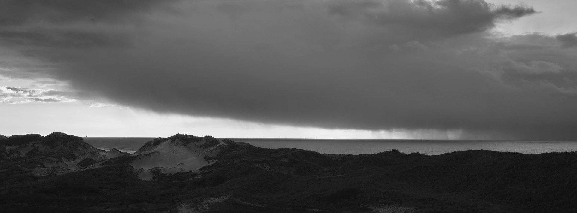 In de loop van de dag neemt de bewolking toe, maar dat neemt niet weg dat ik er ’s middags weer op uit ga, ik verruil de duinen van Schoorl voor die van Bergen en de ‘binnenlandse’ duinen voor die van de zeereep. Onderweg er naar toe af en toe regen, maar daar ben ik op gekleed en dat kan me als elektrische fietser niet echt deren. En eenmaal ter plaatse de beloning: dramatische duinlandschappen verlicht door de zon die als een theater ‘spotlight’ tussen de wolken doorschijnt. En zeegezichten met steeds zwaardere bewolking, regenflarden onttrekken de windturbines bijna aan het zicht. En zelfs na de zonsondergang nog fotograferen in de schemering, een laatste onwerkelijk verlicht duinlandschap.